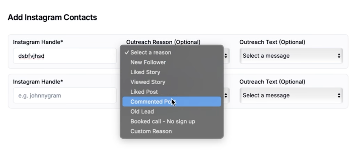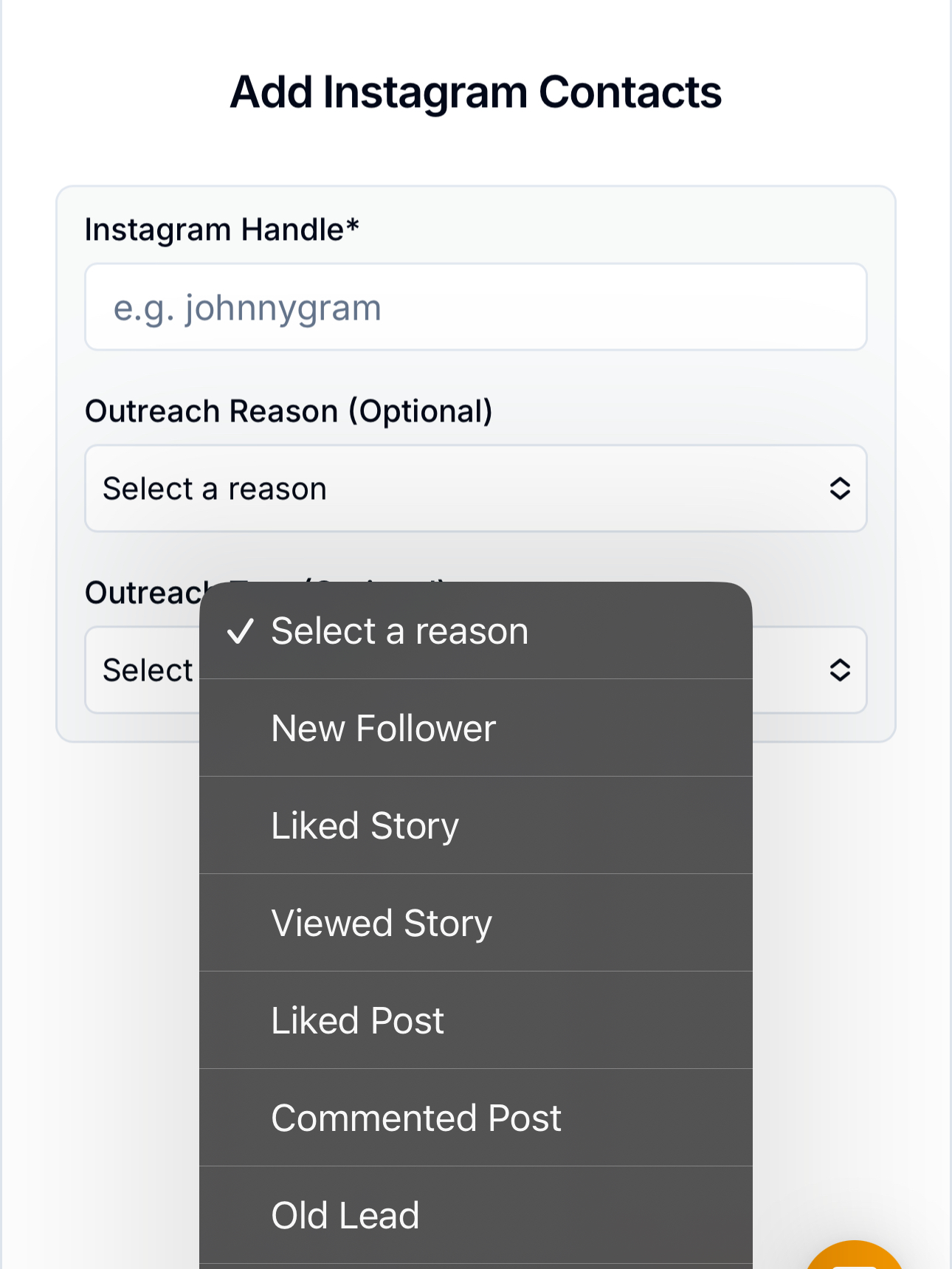 Choose your outreach reason from basic engagement or create a custom reason. This helps filter performance by lead source.